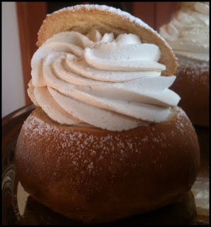About Semlor: Originally these little cream filled buns hark back to the days before Sweden embraced the Lutheran church and were eaten on fat Tuesday with warm milk, though now a days Swedes tend to devour them whenever they can, many of them making themselves sick overdosing on their shire decadence, in fact its said the late King Adolf Fredrik ate so many he croaked!